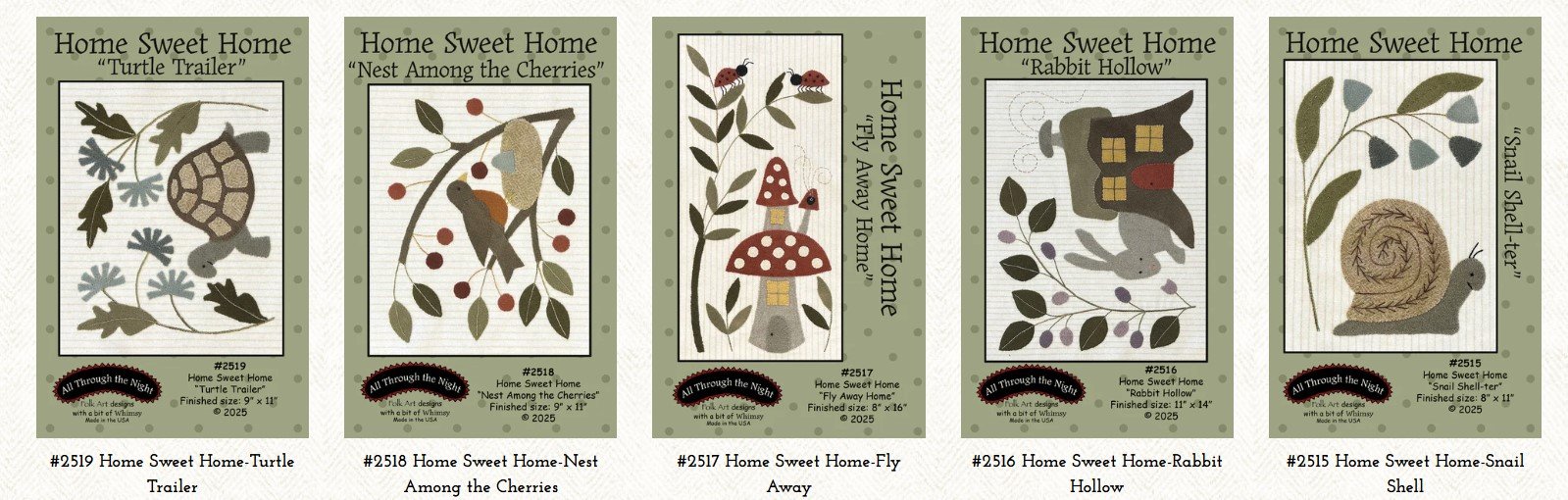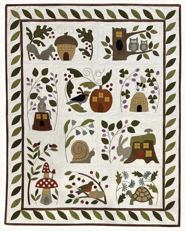 Our new “Home Sweet Home” BOM by Bonnie Sullivan of “All Through the Night” features 10 patterns that showcase small animals and their cozy habitats. Each month you will receive one pattern, the flannel background and wools for the applique. The first month you will also receive our “Intro to Wool Applique” booklet, 1 m of fusible web, and a pack of our favourite stitching needles. At the end of the program you will receive the finishing kit which includes the borders and binding. Price per month includes shipping. HST will be added. Program starts shipping on November 15, 2025.